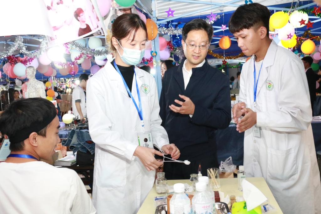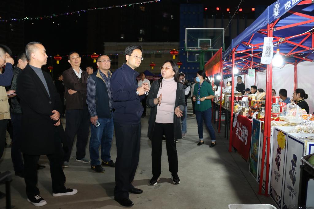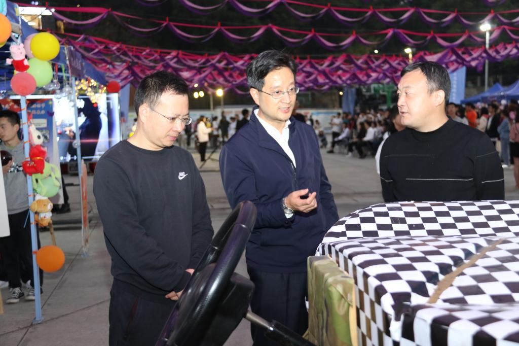 在美食节活动区,人头攒动,一片热闹景象。王斌询问了美食节活动组织开展情况,并督促相关部门加强校园饮食文化建设,进一步优化校园餐饮供给服务格局。王斌来到学校帮扶地区——米易县仙山村、木里县、乡城县农副产品展销区,了解产品信息以及销售情况,与师生亲切互动,同大家一起品尝美食,现场阵阵欢声笑语。
