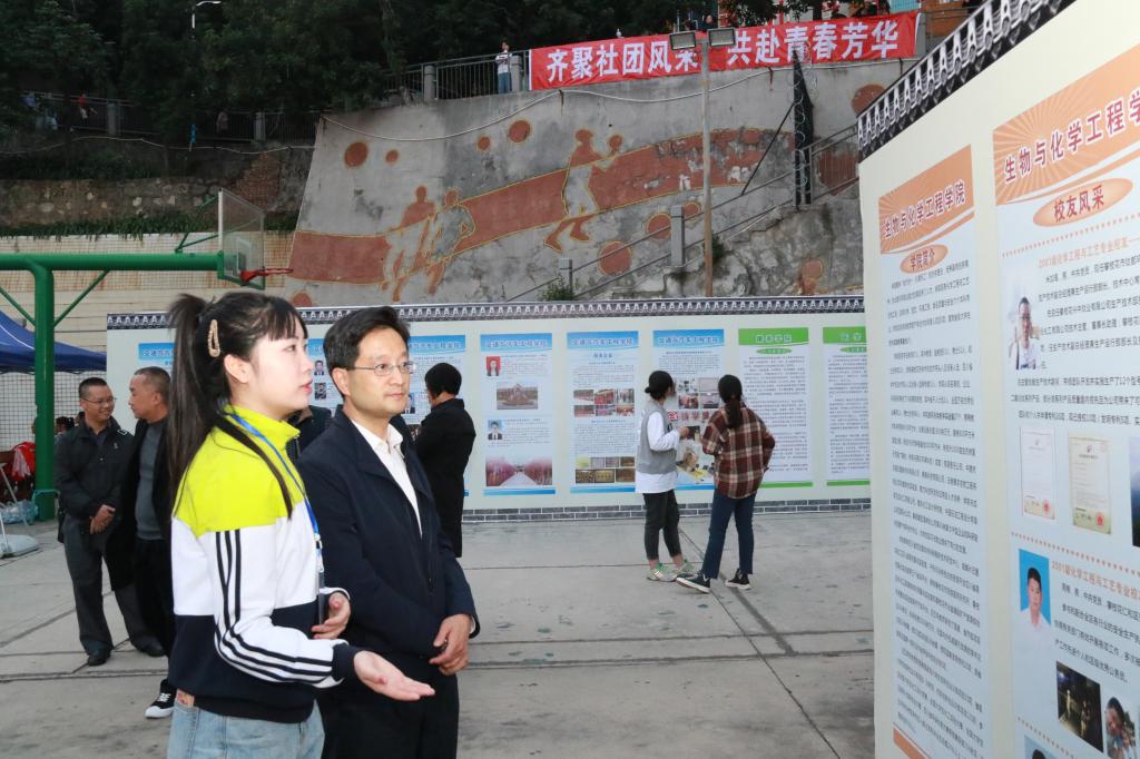 在社团文化节展区,王斌一行参观了各学院优秀校友事迹展,对学校人才培养成果给予了肯定。观看了学生社团成果展示,与学生亲切交谈,了解了第二课堂相关建设情况。