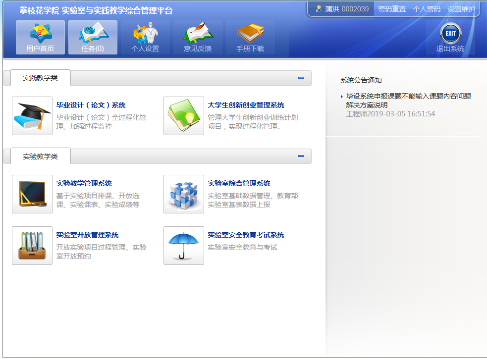 2017年,建成了教学实践管理系统,涉及实验室综合管理、实验室开放管理、实验室安全教育与考试、实验教学管理、毕业设计(论文)管理、大学生创新创业项目管理等模块,有效提高了实践教学管理水平。