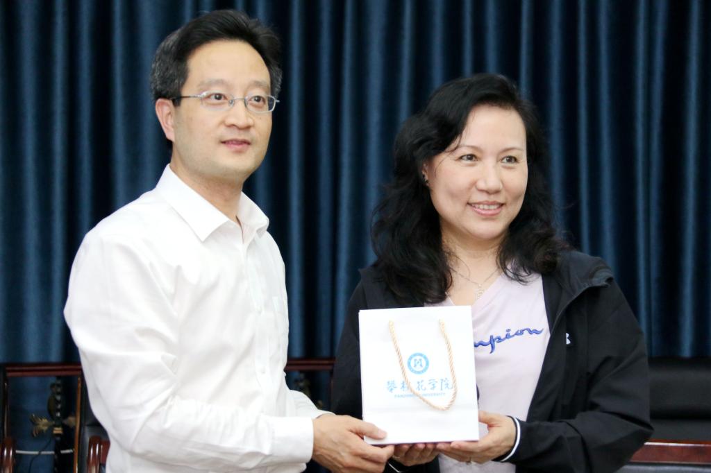马晓凤和王斌分别向方小榕夫妇赠送了钒钛印章、建筑设计用多功能卷尺等特色纪念品。
