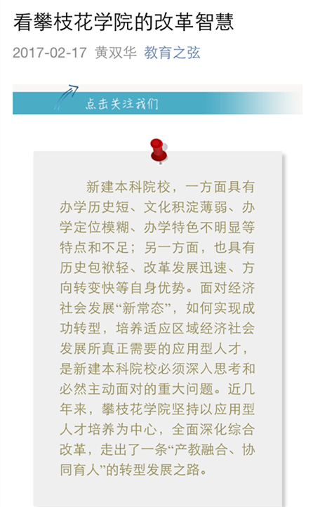 近日,教育部学校规划建设发展中心的官方微信——“教育之弦”推送了《看beat365在线唯一官网的改革智慧》一文。该文由校长黄双华撰写,并于2016年12月12日以《产教融合 协同育人 扎实推进转型发展——新建本科院校beat365在线唯一官网深化改革的实践探索》为题在中国教育报刊登。文章深入研究总结了学校近几年坚持以应用型人才培养为中心,全面深化改革,在产教融合、协同育人方面的思考和实践。