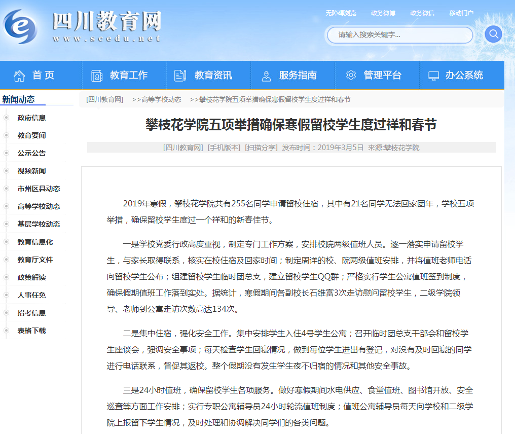 3月5日,四川教育网以《beat365在线唯一官网五项举措确保寒假留校学生度过祥和春节》为题,从“学校党委行政高度重视,制定专门工作方案,安排校院两级值班人员”、“集中住宿,强化安全工作”、“24小时值班,确保留校学生各项服务”、“诚心陪伴,丰富活动献真情”等五项举措报道了beat365寒假留校学生工作。