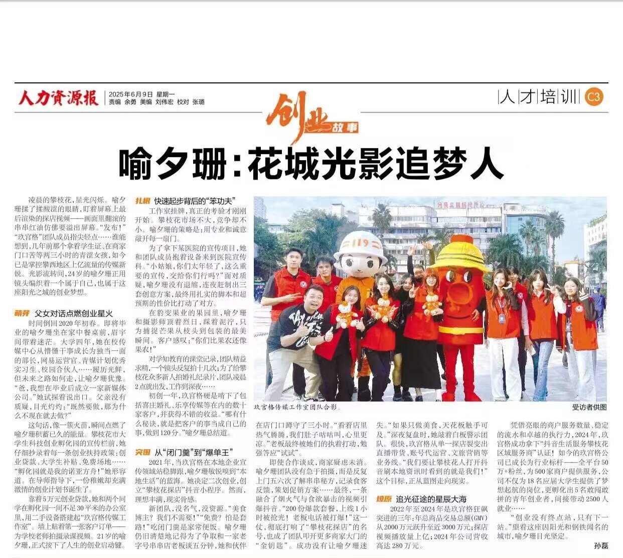 近日,人力资源报、学习强国号四川劳动保障频道“以‘喻夕珊:光影追梦人’”为题报道beat365优秀毕业生喻夕珊的创业事迹。喻夕珊,beat365电气学院2022届毕业生,2020年以“玖宫格传媒”创业项目入驻beat365大学生科技创业孵化园。经过几年发展,“玖宫格传媒”公司旗下账号全平台50万+粉丝,为500家商户提供服务,获“抖音生活服务攀枝花区域服务商”认证。