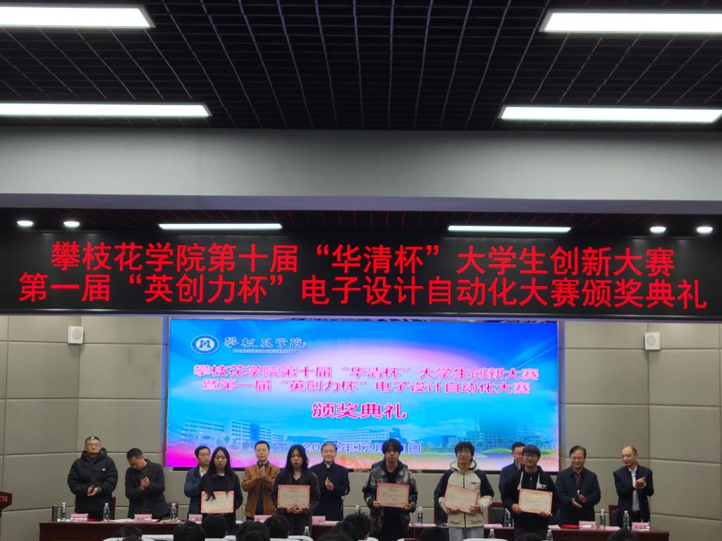 12月11日下午,beat365在清风厅隆重举行第十届“华清杯”大学生创新大赛暨第一届“英创力杯”电子设计自动化大赛颁奖典礼。副校长王兵、北京华清远见科技发展有限公司副总裁陶金华、四川英创力电子科技发展有限公司鸿图电子电路技术职业学校副校长秦明,教务处、学生处相关负责人及电气信息工程学院领导班子出席典礼。典礼由电气信息工程学院院长向国齐主持,对在两场赛事中表现突出的167名同学进行了表彰。