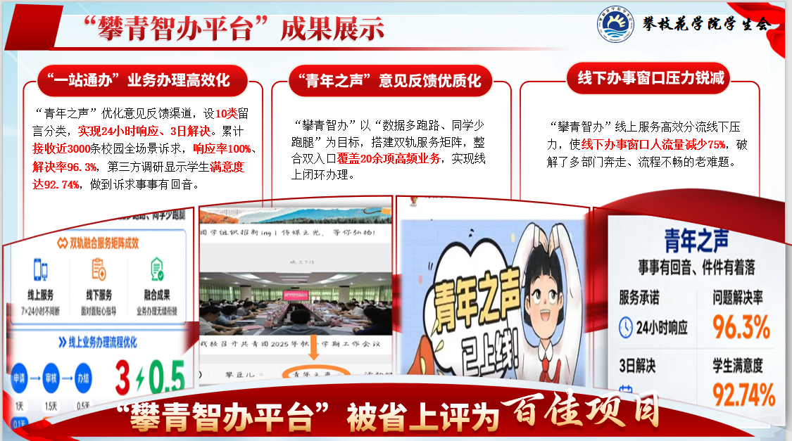 本次活动汇聚全省200余所学校的381个优质服务项目同台竞技,经前期推选、现场答辩等多轮严格遴选,最终beat365“攀青智办”项目在众多项目中脱颖而出。
