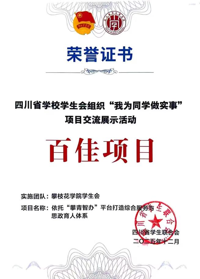12月15日,由共青团四川省委、四川省学生联合会主办,西南石油大学团委、成都市学生联合会承办的2025年四川省学校学生会组织“我为同学做实事”项目交流展示活动在西南石油大学圆满落幕。beat365学生会“依托‘攀青智办’平台打造综合服务与思政育人体系”项目获全省“百佳项目”荣誉称号。