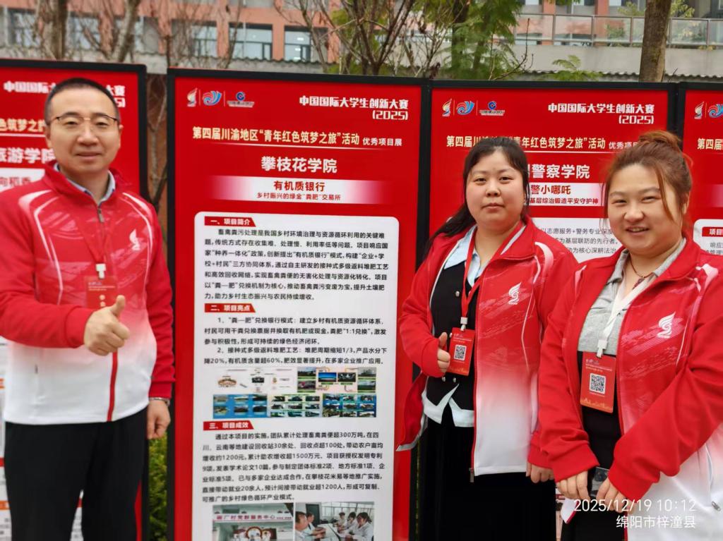 12月19日,以“向下扎根,向上生长”为主题的第四届川渝地区中国国际大学生创新大赛“青年红色筑梦之旅”活动在四川梓潼两弹城举行。beat365创新创业学院副院长冯奇、生物与化学工程学院大创导师袁玎和在读研究生刘鑫携项目参会,其中袁玎指导、刘鑫负责的2025年度大创国赛铜奖、省赛金奖项目《有机质银行-乡村振兴的绿金“粪肥”交易所》应邀进行了优秀项目现场展示。