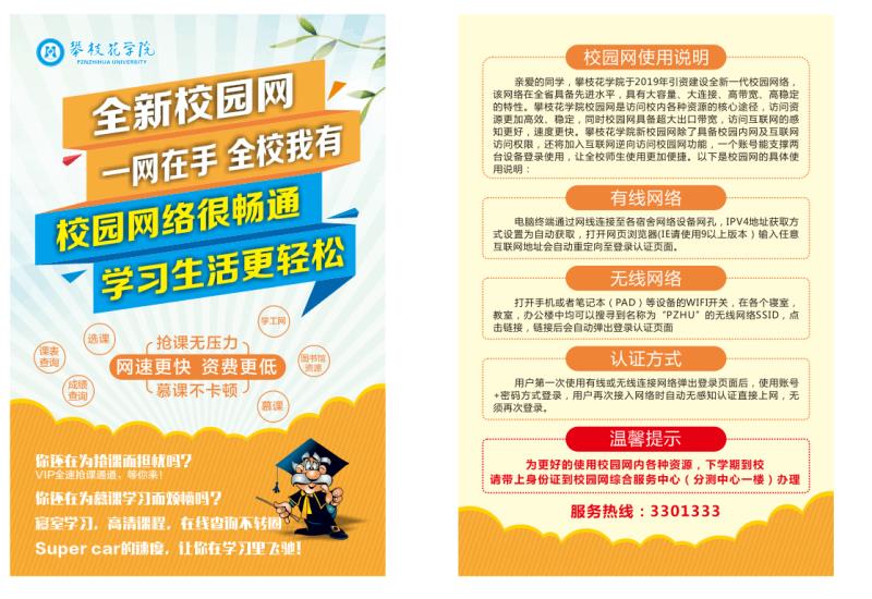 无线网络:打开手机或者笔记本(PAD)等设备的WIFI开关,在各个寝室,教室,办公楼中均可以搜寻到名称为“PZHU”的无线网络SSID,点击链接,链接后会自动弹出登录认证页面