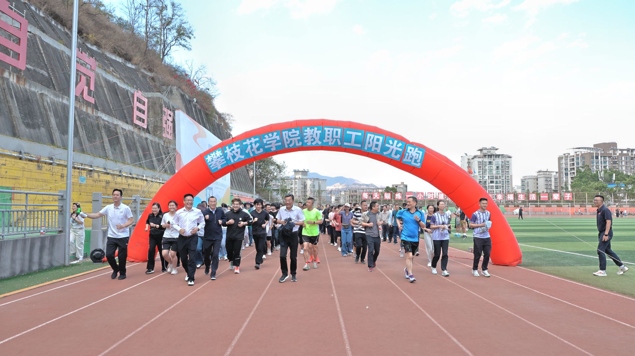 校工会常务副主席罗钧梅代表校工会倡议全体教职工快乐参与、安全第一,量力而行、科学运动,安心享受奔跑乐趣;持之以恒、养成习惯,以本次活动为起点,让运动融入日常生活;凝心聚力、奋勇争先,将阳光向上的运动精神转化为干事创业动力,为学校内涵发展、服务地方贡献力量。