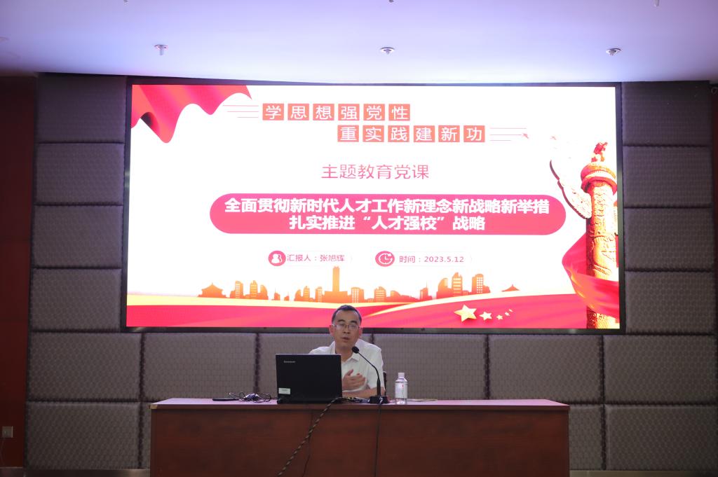 根据学习贯彻习近平新时代中国特色社会主义思想主题教育相关工作部署,按照“学思想、强党性、重实践、建新功”的主题教育总要求,为把习近平新时代中国特色社会主义思想转化为坚定理想、锤炼党性和指导实践、推动工作的强大力量,5月12日下午,副校长张旭辉在行政楼416会议室以《全面贯彻新时代人才工作新理念新战略新举措扎实推进“人才强校”战略》为题讲授主题教育专题党课。党委组织部、人事处(党委教师工作部、职改办)、发展规划处、国际教育学院(国际交流与合作处)和经管学院教师党员60人参加党课学习。