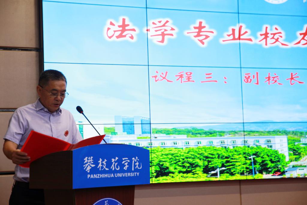 法学专业校友分会会长李明华致感谢词,他表示在校友总会领导下,积极开展工作,带领法学专业校友分会紧紧围绕学校应用型一流大学的发展目标和法学院高质量发展的愿景,以感情为纽带,以沟通为基础,以合作为前提,以服务为途径,广泛联络校友,整合校友资源,形成学校关心校友、校友心系母校、互相支持、共同发展的良好局面。