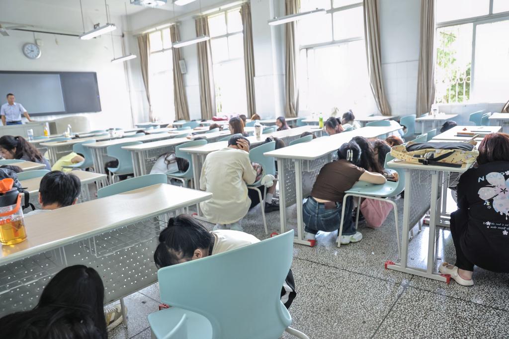 9时40分,随着第一次地震波的到达,学生在教师、辅导员、公寓管理员的指导下用书顶在头顶躲在桌下、墙角紧急就地避险。