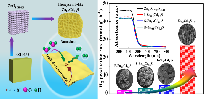 论文《Ultra-thin nanosheet assembled 3D honeycomb-like Zn0.5Cd0.5S for boosting photocatalytic H2evolution》以结构新颖的PZH-139有机金属框架为牺牲模板,首次制备出由超薄纳米片组装的蜂窝状Zn0.5Cd0.5S催化剂,由于超薄纳米片缩短了载流子传输距离,从而极大的提升了光催化产氢活性。