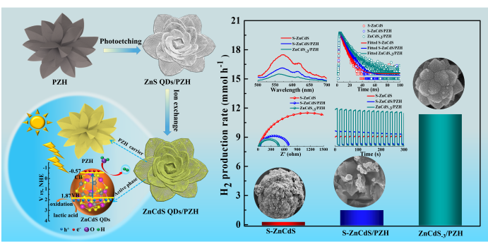 论文《Facile synthesis of ZnCdS quantum dots via a novel photoetching MOF strategy for boosting photocatalytic hydrogen evolution》利用脲热法合成出耐酸耐碱的高稳定性有机金属框架PZH,并首次创造性地采用光刻蚀法在保留PZH框架的同时,可控合成出分散性良好的量子点ZnCdS,通过ZnCdS QDs和PZH的协同作用降低了氢吸附吉布斯自由能,显著提升了光催化产氢活性和稳定性。