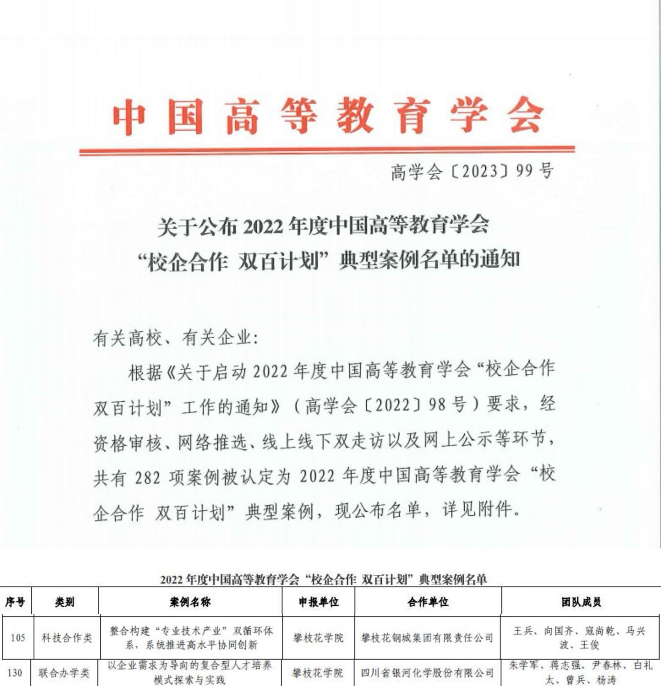“整合构建‘专业技术产业’双循环体系系统推进高水平协同创新”项目,由产教融合发展部牵头,与攀枝花钢城集团有限责任公司合作,旨在共创人才培养新体系、共建科技研发新平台、共同营造成果孵化转化新模式、共构协同创新新机制,立足学科专业面向产业,整合校企双方资源,创新构建形成了校内、校外双循环体系。“以企业需求为导向的复合型人才培养模式探索与实践”项目,由生物与化学工程学院牵头,与四川省银河化学股份有限公司合作,共建攀枝花国际中铬产业研究院,中铬院系国内首次针对铬盐细分垂直领域展开的校企合作探索,目前组织框架已搭建完毕,以科技研发过程为中心的科技项目合作已破题,校企共建的工程实验中心已初具规模。