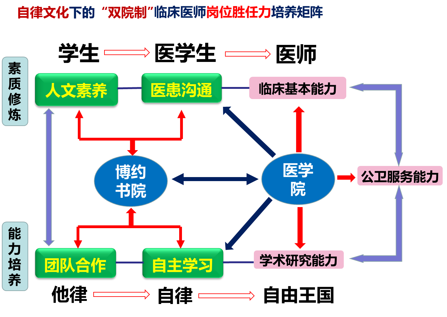学院开创了“学院+书院”的“双院制”教学模式,强化课程思政建设,通过自律医学生成长课程育人体系、德技双馨医学生评价体系以及医学生社团能力建设体系,全面提升自律医学生实践创新能力,促进其身心健康发展,练就新时代中国特色社会主义医学人才。