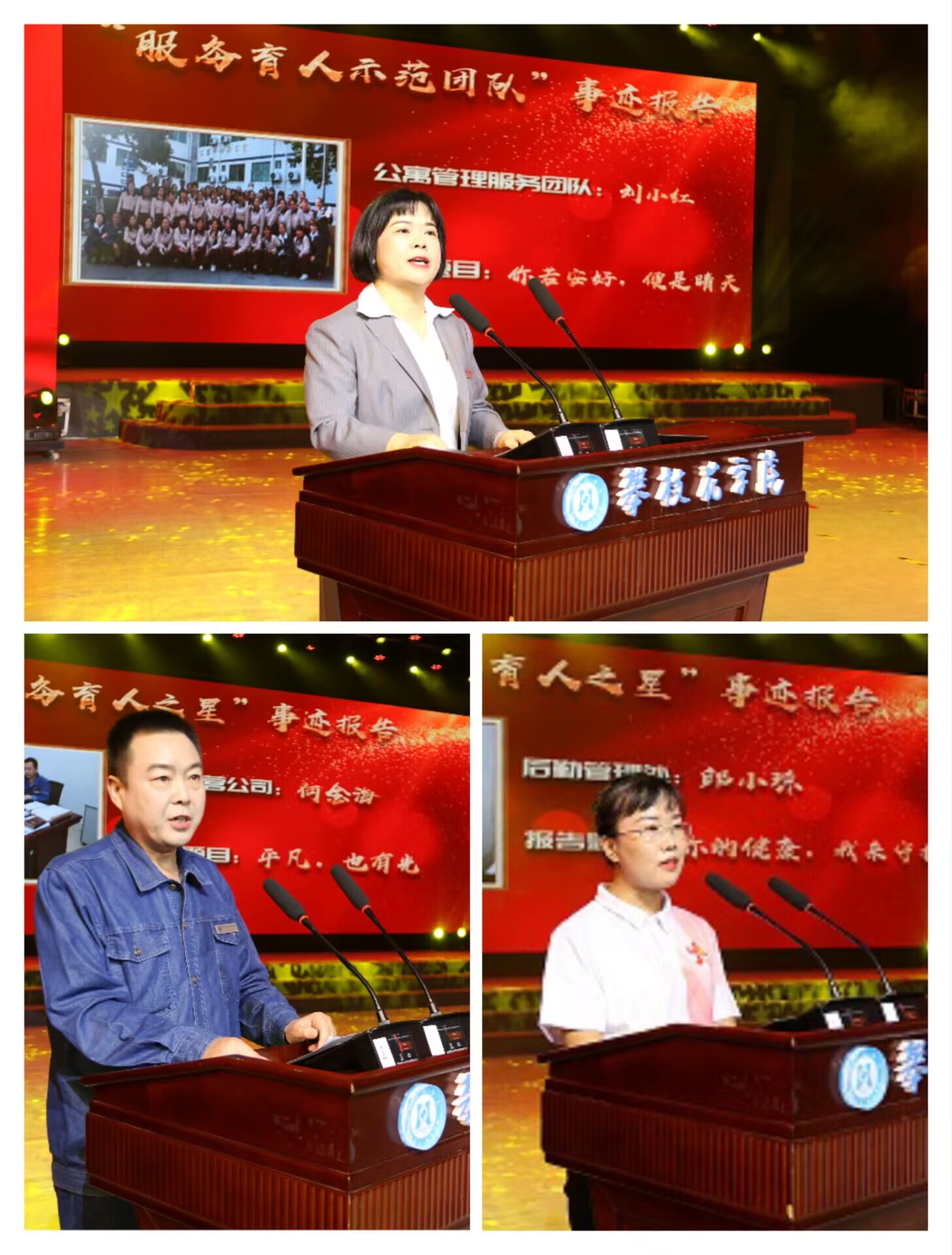 “服务育人之星”代表——来自后勤管理处的邱小琼、来自资产经营公司的何金海以及“服务育人示范团队”代表——来自资产经营公司学生公寓管理服务育团队刘小红分别做事迹报告,共同表达对学校的感谢,对后勤工作的热爱,对未来做好后勤工作的信心和决心。