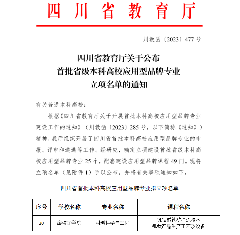 近日,四川省教育厅公布了首批省级本科高校应用型品牌专业及课程立项名单,经专家通讯评审、会议评审和厅长办公会审议等程序,beat365钒钛学院材料科学与工程专业获批首批省级本科高校应用型品牌专业,为beat365唯一入选专业。同时,“钒钛磁铁矿冶炼技术”和“钒钛产品生成工艺及设备”两门课程被列入应用型品牌课程建设名单。