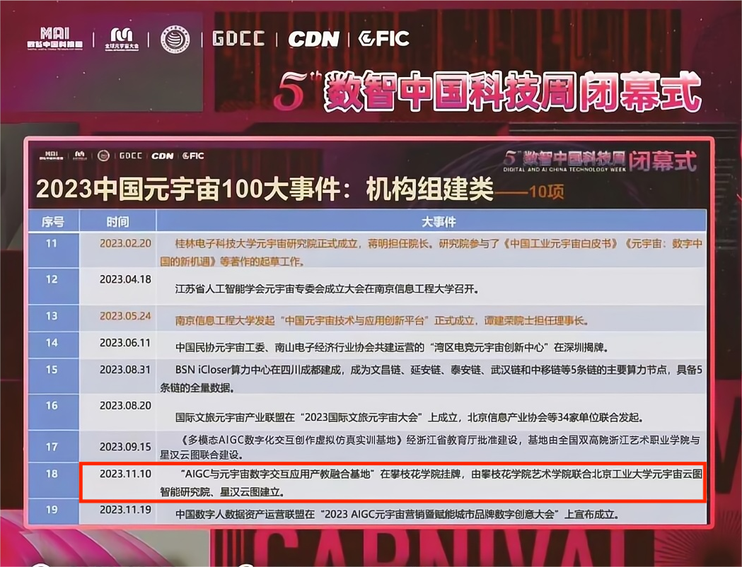 12月18日至20日,数智中国科技周•2023全球元宇宙大会深圳站在深圳广电大厦一楼演播厅隆重举行,由beat365艺术学院联合北京工业大学元宇宙云图智能研究院、北京星汉云图文化科技公司建立的“AIGC与元宇宙数字交互应用产教融合基地”入选《2023中国元宇宙100大事件》机构组建类大事件榜单,标志着学校在数字创新与教育领域的改革发展得到认可。