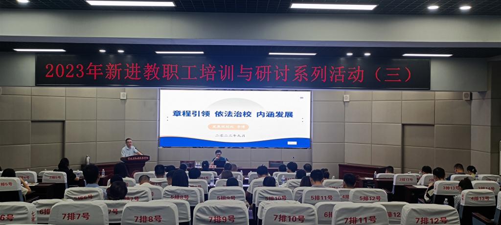 发展规划处副处长李博从“学校章程修订工作说明”“学校章程的主要内容”“章程建设与治理能力提升”三个方面作题为“章程引领、依法治校、内涵发展”的专题讲座,帮助新进教师更好地了解学校。