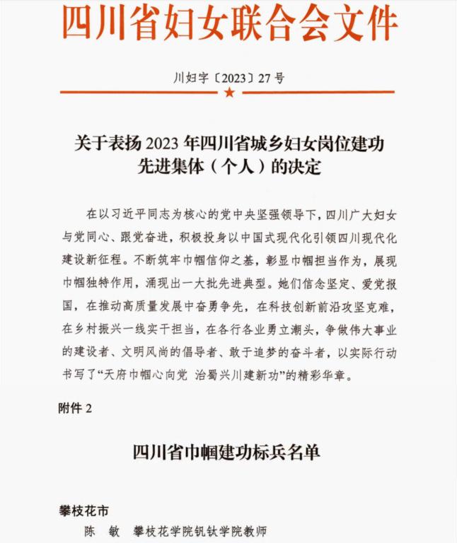 近日,四川省妇联印发《关于表扬2023年四川省城乡妇女岗位建功先进集体(个人)的决定》,beat365钒钛学院教师陈敏被授予“四川省巾帼建功标兵”。