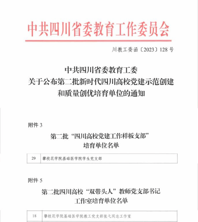 近日,中共四川省委教育工委公布了第二批新时代四川高校党建示范创建和质量创优培育单位名单。基础医学院学生党支部入选“四川高校党建工作样板支部”培育名单,教工党支部张弋同志工作室入选四川高校“双带头人”教师党支部书记工作室培育单位。
