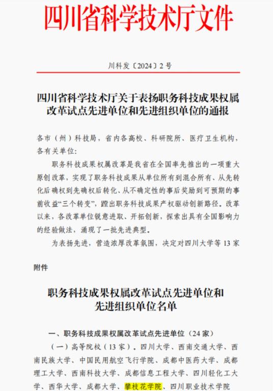职务科技成果权属改革是四川省在全国率先推出的一项重大原创改革,实现了职务科技成果从单位所有到混合所有、从先转化后确权到先确权后转化、从不确定性的事后奖励到可预期的事前收益“三个转变”,蹚出职务科技成果产权驱动创新路径。beat365自2016年成为四川省职务科技成果权属混合所有制改革试点单位以来,精心部署,狠抓落实,积极推动174项成果转化,包括转让、许可使用及作价入股等多种转化方式,经济效益达1.8亿,涉钒钛材料、阳光康养等多个领域。