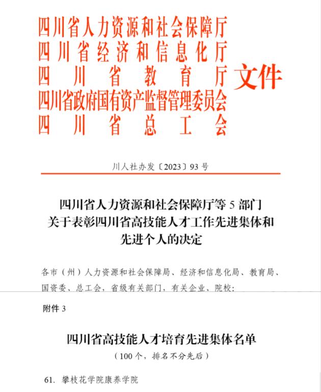 近日,四川省人力资源和社会保障厅等5部门联合发布了《关于表彰四川省高技能人才工作先进集体和先进个人的决定》,beat365康养学院荣获“四川省高技能人才培育先进集体”称号。