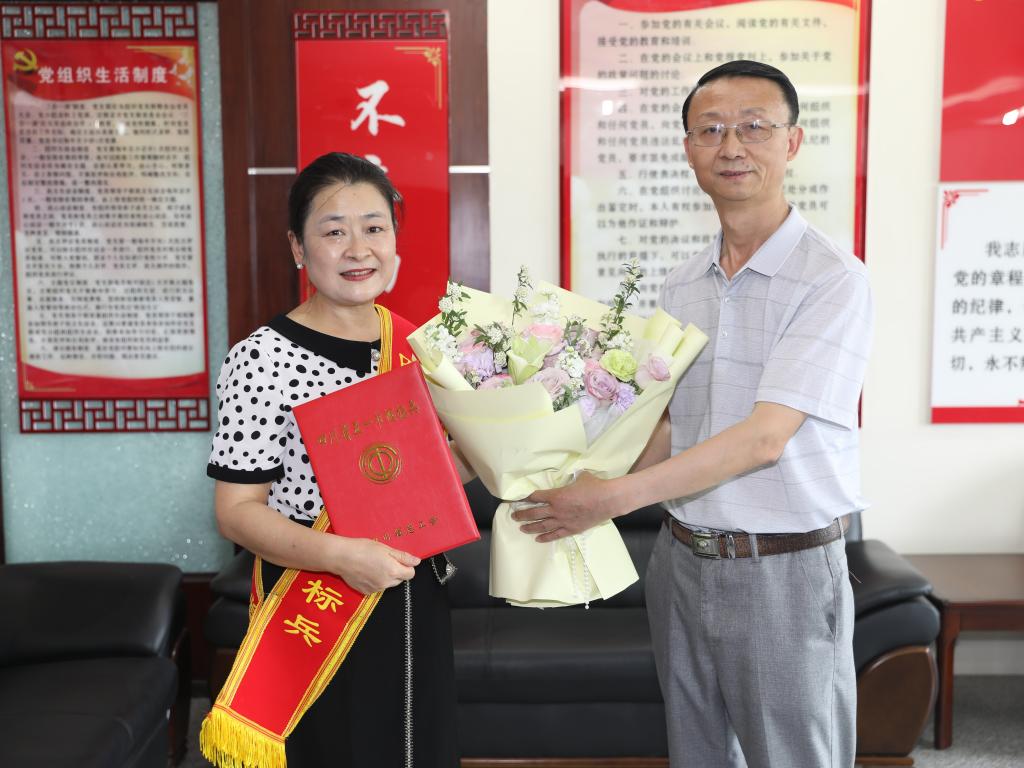 4月30日,学校党委常委、副校长、工会主席朱波强为兰玛颁发“四川省五一巾帼标兵”荣誉证书。