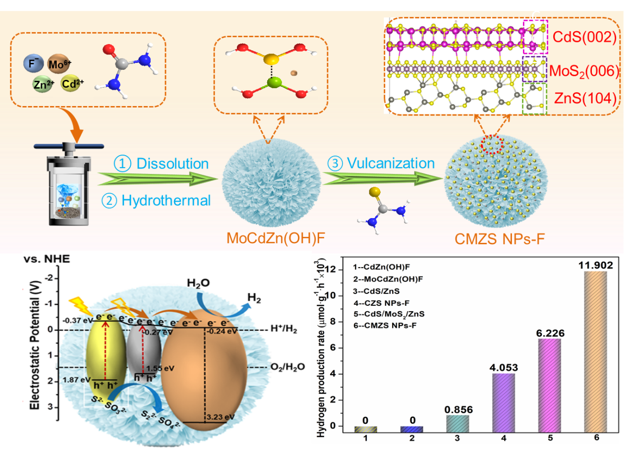 近日,beat365生物与化学工程学院(农学院)杨海燕博士作为第一作者,beat365在线唯一官网为第一单位在工程技术领域国际著名期刊《Separationand Purification Technology》(中科院1区top期刊)上发表题为“Steppedfluorinated CdS/MoS2/ZnS nanoparticles constructed on amultifunctional platform with Zn(OH)F nanoflowers for highly activephotocatalytic H2 production”的研究论文。