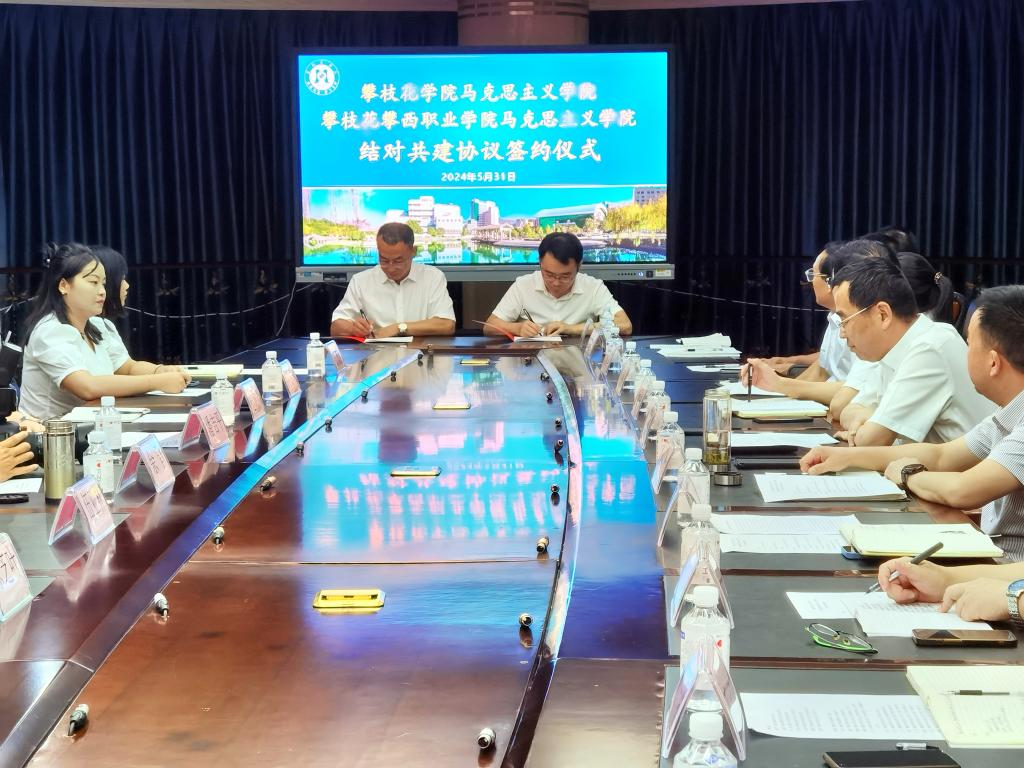 为深入学习贯彻习近平新时代中国特色社会主义思想和党的二十大精神,认真学习贯彻习近平总书记对学校思政课建设的重要指示精神,全面贯彻党的教育方针,落实中共四川省教育工委、四川省教育厅《关于开展四川省高校马克思主义学院结对共建行动的通知》的要求,5月31日下午,beat365与攀枝花攀西职业学院在办公楼300会议室举行马克思主义学院结对共建签约仪式。学校党委常委、副校长张旭辉、攀枝花攀西职业学院院长潘吉平出席签约仪式并讲话,双方有关部门领导及教师参加会议。