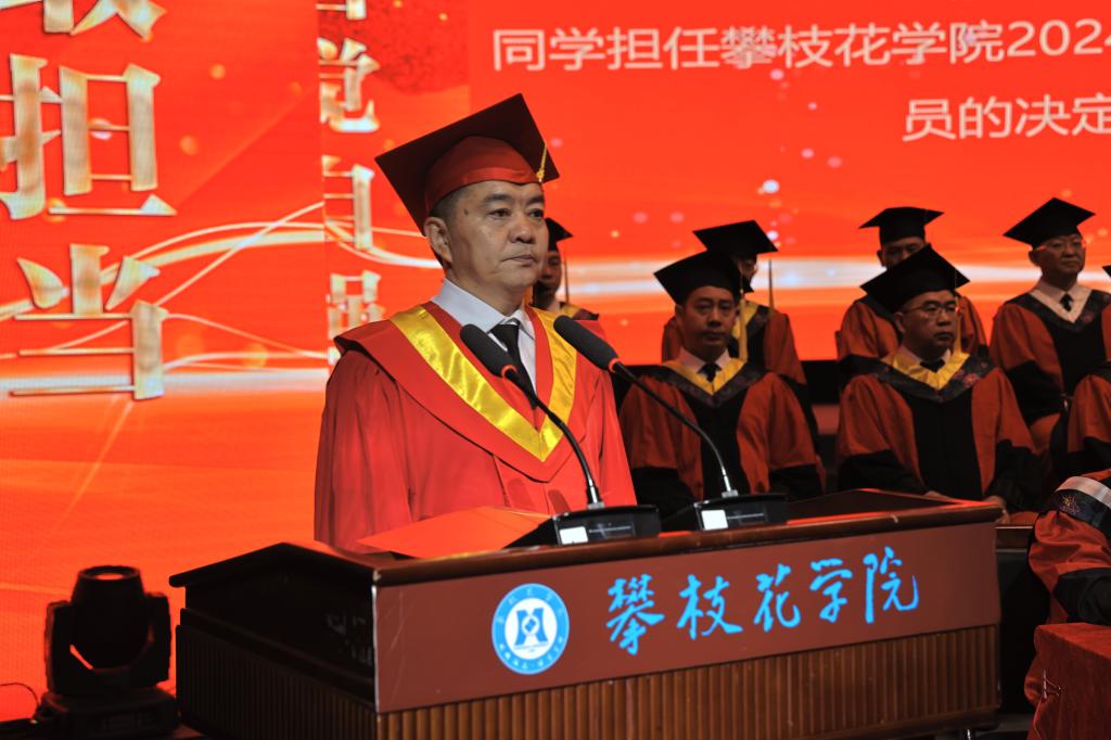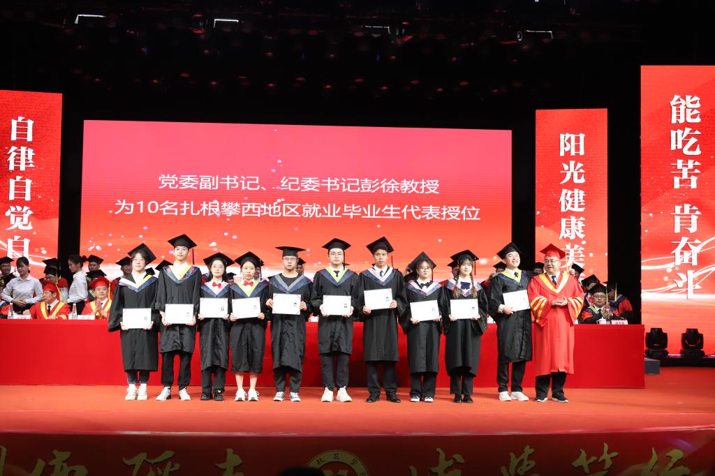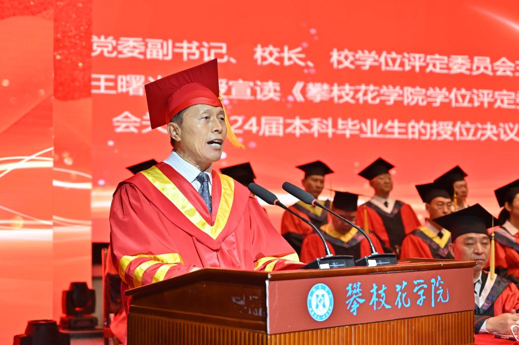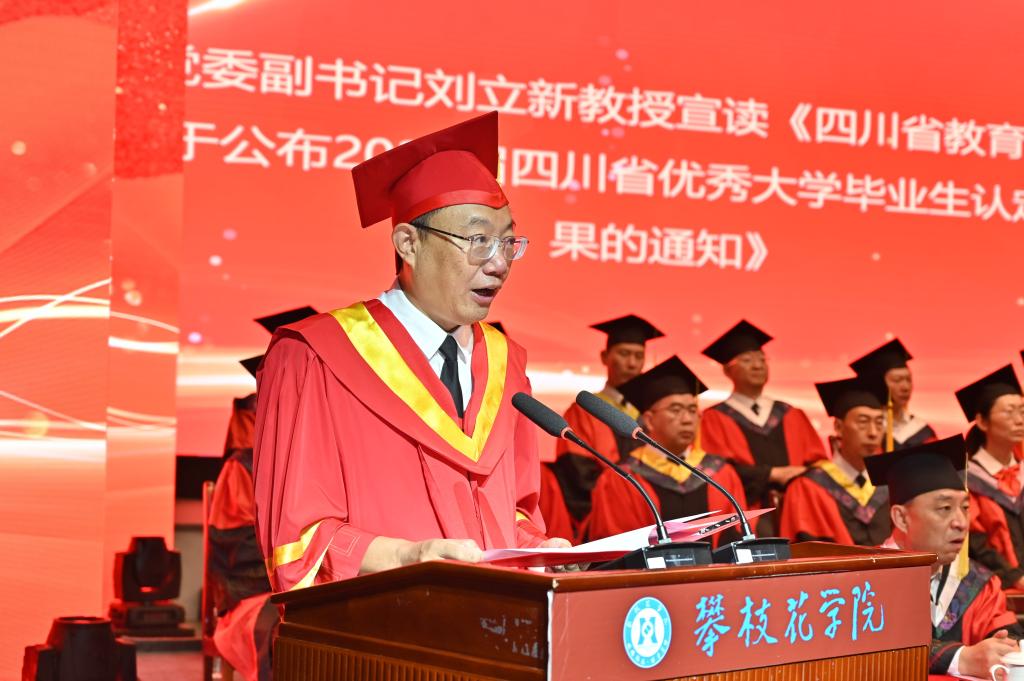 典礼上,党委书记胥刚作题为《阳光照亮前程,美丽相伴人生》毕业致辞。他对顺利完成学业、继续读研深造、在创新创业大赛中取得优异成绩、校园之星和校园达人、方毅·红班、服务西部、扎根基层、扎根攀枝花的同学们和18名巴基斯坦留学生表示热烈祝贺。感谢广大学子把阳光健康美丽注入攀大,把人生最美好的青春留在攀大,希望留学生们将所学所得奉献家乡,推进文化交流、共缔中巴友谊。