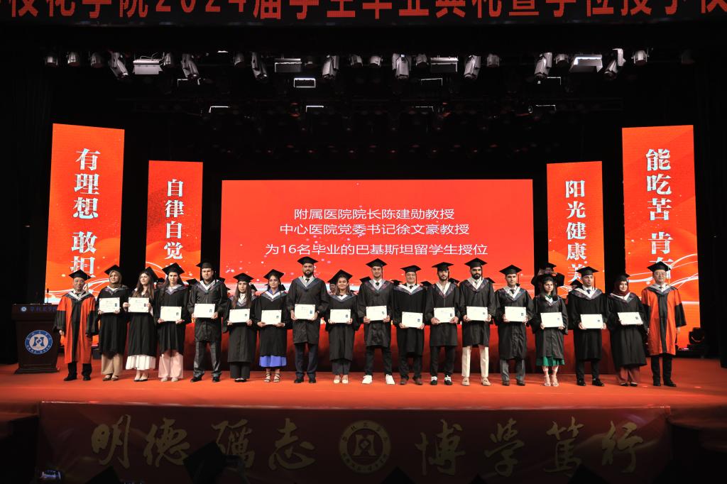 在毕业生授位环节,胥刚为四川省优秀大学毕业生代表13人授位,王曙光为学习标兵代表13人授位,彭徐为扎根攀枝花地区就业毕业生代表10人授位,刘立新、朱波强、石维富、王兵、朱云生分别为“青马班”毕业生代表、方毅•红班毕业生代表、校园达人毕业生代表、校友联络员代表、寝室集体考取研究生毕业生代表授位,附属医院党委书记田巨龙、中心医院党委书记徐文豪为毕业的巴基斯坦留学生18人授位。一线教师代表张士举为13名优秀毕业(论文)设计毕业生代表授位。授位导师依次为参加现场授位的毕业生授位。