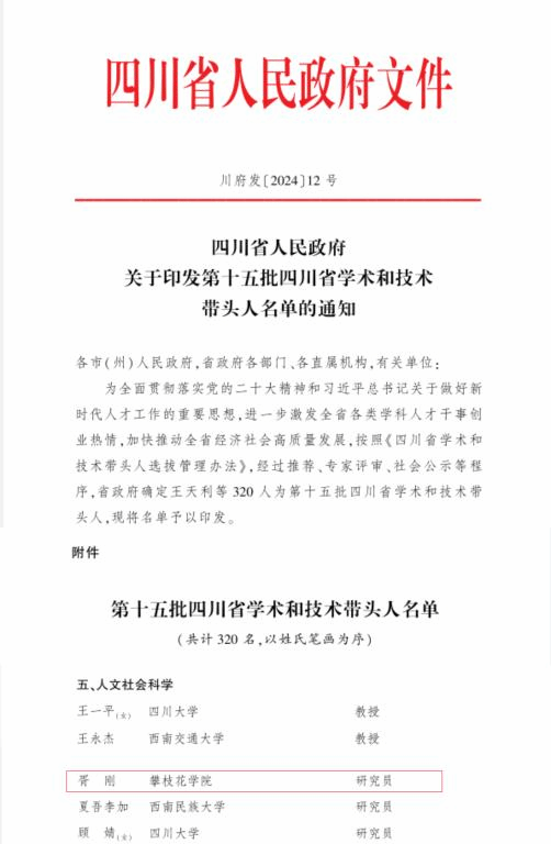 攀枝花市学术和技术带头人:田从学、朱学军、吴恩辉、张靖、秦振涛、魏弦、李会容、刘姗、代俊、李东、杨勇攀、曹利华、廖红;
