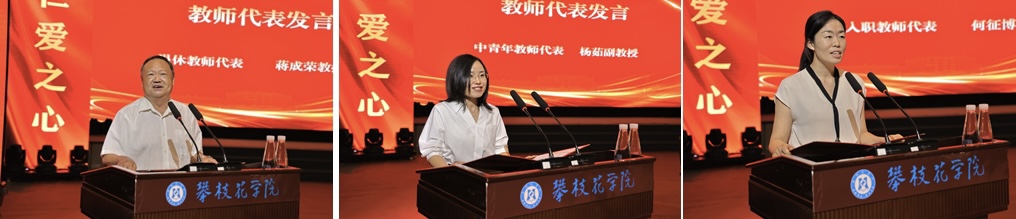 光荣从教30年退休教师代表蒋成荣、中青年教师代表杨茹、新入职教师代表何征分别分享了自己的心得体会。他们表示,教育工作者的首要职责是教书育人,在新时代新征程中将深刻领悟并践行“教育家精神”,始终保持高度责任感和强烈使命感,始终坚守立德树人的根本任务,坚持“以学生为中心”的教学理念,有爱心、有耐心,不断提升自身专业素养,守正创新,当好学生的同行者、引路人。
