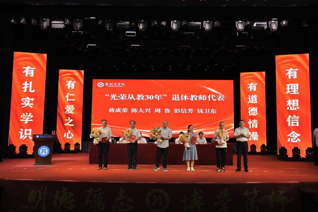 党委书记胥刚为蒋成荣、陈大兴、周鲁、彭信芳、钱卫东5位“光荣从教三十年”的退休教师颁发荣誉证书。
