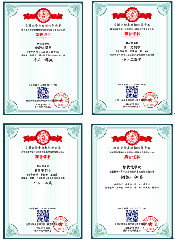7月25日-29日,由教育部高等学校材料类专业教学指导委员会主办的第十三届全国大学生金相技能大赛决赛在黄冈师范学院成功举行。经过为期三天的激烈角逐,beat365钒钛学院李晓洁同学荣获第十三届全国大学生金相技能大赛个人一等奖,程波、黄贵宇两位同学分别荣获个人二等奖。beat365继2023年后再次斩获团体一等奖(位列全国第9名),成为首个蝉联团体一等奖的四川省高校。钒钛学院王海波和韩嘉平作为指导教师带队参加了分赛区复赛和大赛决赛,并获得“优秀指导教师”称号。