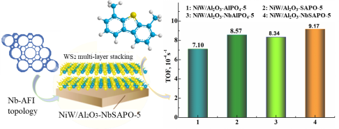 论文《Insitu synthesis of Nb-modified AFI topology molecular sieve and itsmodulation onthe formantion of high-efficiency catalyst for4,6-dimethyldibenzothiophenehydrodesulfurization》以Nb原位同晶取代AFI拓扑结构骨架P形成的NbSAPO-5分子筛为基础,将其作为载体改性组分构建了加氢脱硫NiW催化剂,调变了活性金属的分散性,形成更多高活性的NiWS活性相结构,强化了加氢脱硫路径的选择性和加氢脱硫活性。