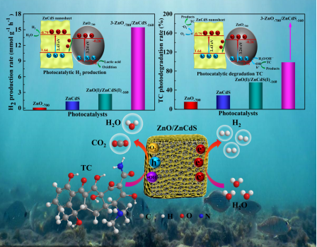 论文《Elaborateconstruction of a MOF-derived novel morphology Z-scheme ZnO/ZnCdSheterojunction for enhancing photocatalytic H2 evolution andtetracycline degradation》以Zn基金属有机框架PZH-139作为模版制备了形貌独特的Z型直接接触异质结光催化剂ZnO/ZnCdS,将超薄纳米片组装的多级形貌ZnCdS织构在具有丰富空隙的ZnO纳米球上,Z型异质结相对于单相ZnO和ZnCdS具有更强的氧化还原能力以及独特形貌快速的载流子分离能力,显著提升了光催化裂解水产氢活性和降解四环素的性能。