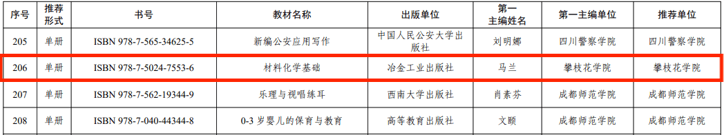 近日,四川省教育厅公布了第一批四川省“十四五”普通高等教育本科规划教材书目(川教函[2024]496号),beat365钒钛学院马兰教授及其教学团队编写的《材料化学基础》成功入选。