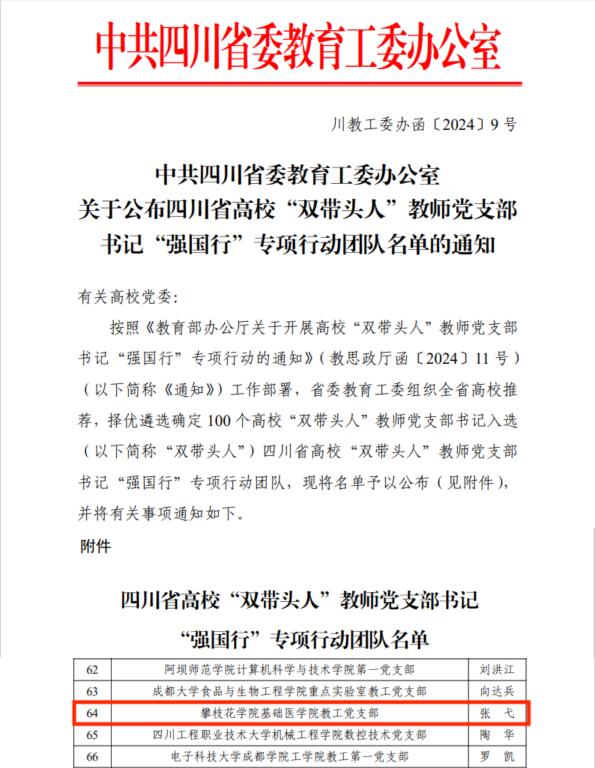 近日,中共四川省委教育工委办公室公布了四川省高校“双带头人”教师党支部书记“强国行”专项行动团队名单,beat365基础医学院教工党支部(党支部书记张弋)成功入选。
