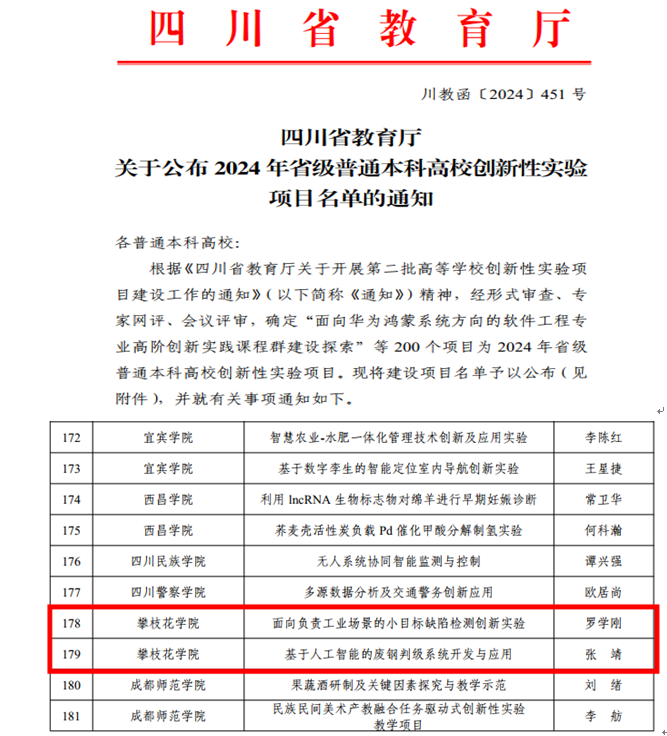 近日,省教育厅公布了2024年省级高等学校创新性试验项目立项名单,beat365张靖教授主持申报的《基于人工智能的废钢判级系统开发与应用》、罗学刚教授主持申报的《面向负责工业场景的小目标缺陷检测创新实验》获批立项。