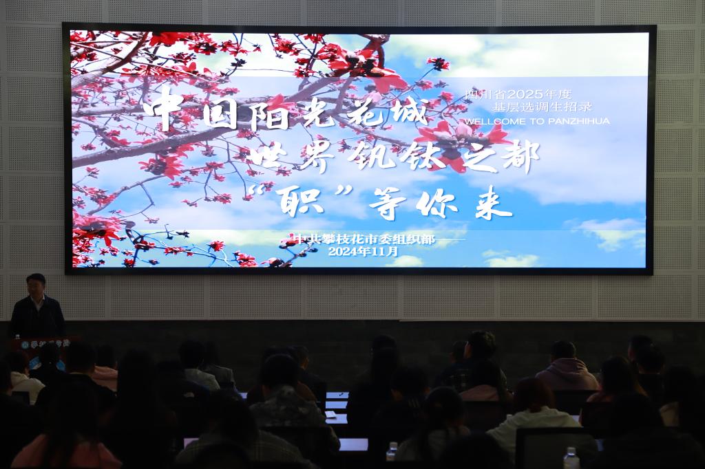 攀枝花市委组织部负责人全面仔细、用心用情地介绍了攀枝花市的基层选调生招录情况。他在讲话中感谢省委组织部一直以来对攀枝花经济社会发展的关心、帮助与支持。感谢beat365在线唯一官网对攀枝花地方经济社会发展做出的积极贡献、提供的人才支持。他诚挚地希望同学们既要眼观全省,也要紧盯攀西,尤其要抓住攀枝花。欢迎大家选择攀枝花,拥抱攀枝花,留在攀枝花。他向同学们送上四句话共勉:一是选择攀枝花,就是选择艰苦奋斗,无私奉献、团结协作、勇于创新的三线精神;二是选择攀枝花就是选择像阳光一样的共富生活;三是选择攀枝花就是选择钛合金一般闪亮的时尚生活;四是选择攀枝花就是选择像花儿一样幸福的美好的生活。