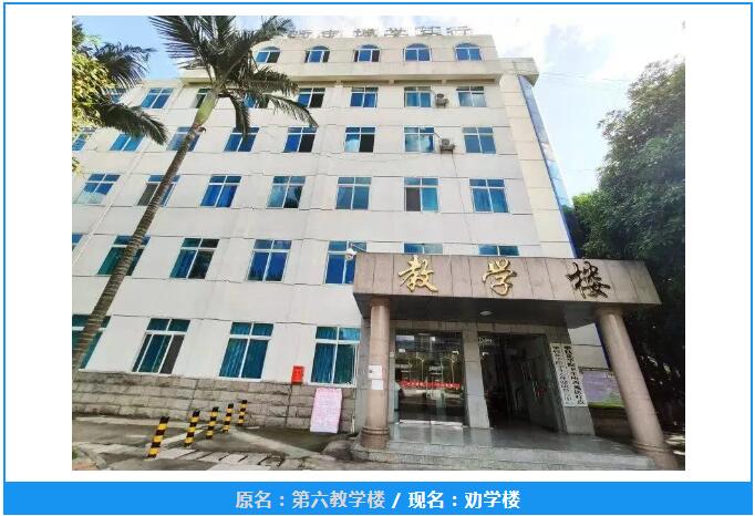 教学楼均以“学”字贯之,分别取“志学、尚学”“勤学、劝学”(志于学、尚于学、勤于学、勉于学);因第三教学楼集艺术学院办公、教学为一体,取其院训“游于艺”命名为“游艺楼”。
