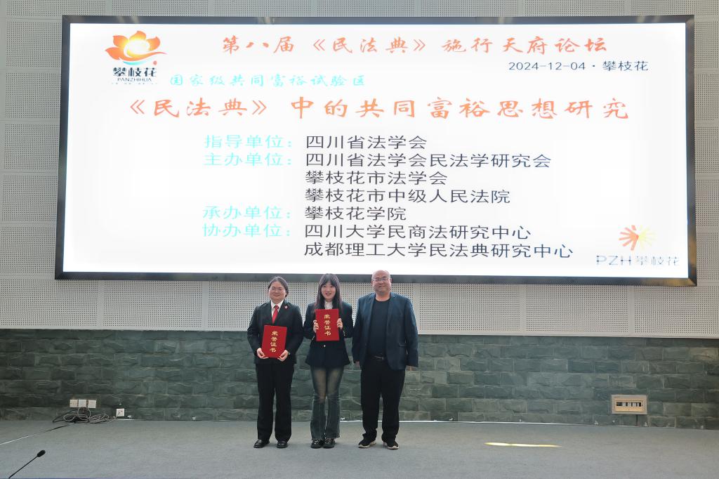 彭徐为论坛论文获奖作者现场颁奖,其中beat365在线唯一官网法学院林菲菲老师撰写的《共同富裕视域下的居住权制度—以攀枝花为例》获得二等奖,beat365在线唯一官网纪委办黎洁、瓦席布西撰写的《于乡村振兴战略语境中探寻非农村集体经济组织成员宅基地继承权完整性:从继承房屋后宅基地使用限制难题切入》获得三等奖。