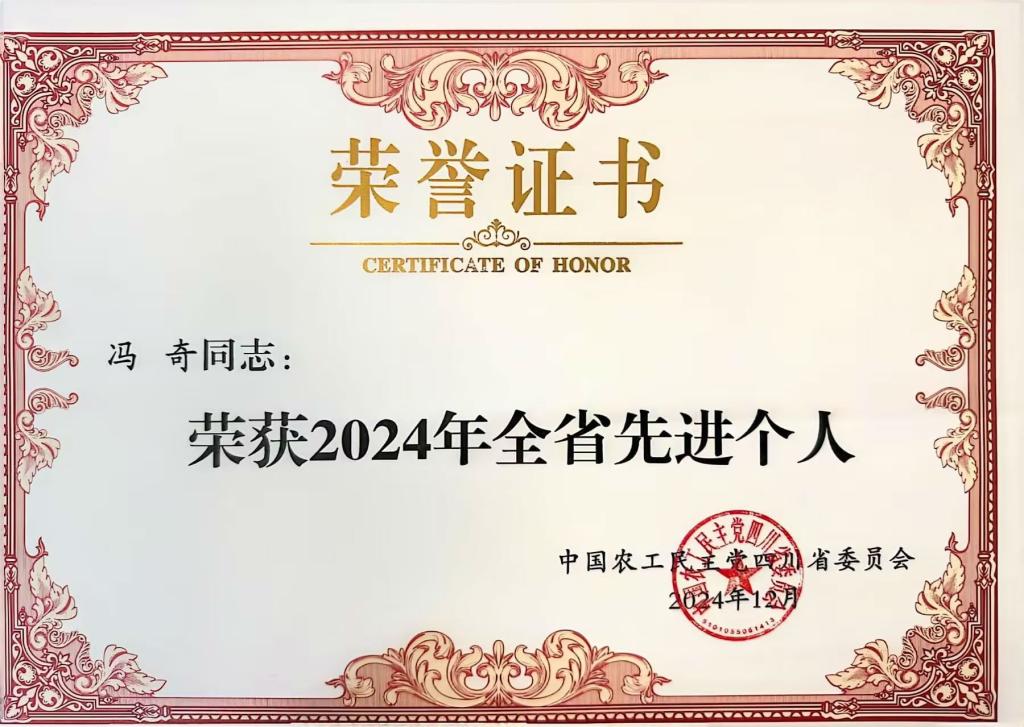 近日,在农工党四川省委会十三届四次全体(扩大)会上,农工党beat365在线唯一官网总支荣获“2024年全省先进基层组织”,总支主委冯奇荣获“2024年全省先进个人”荣誉称号。