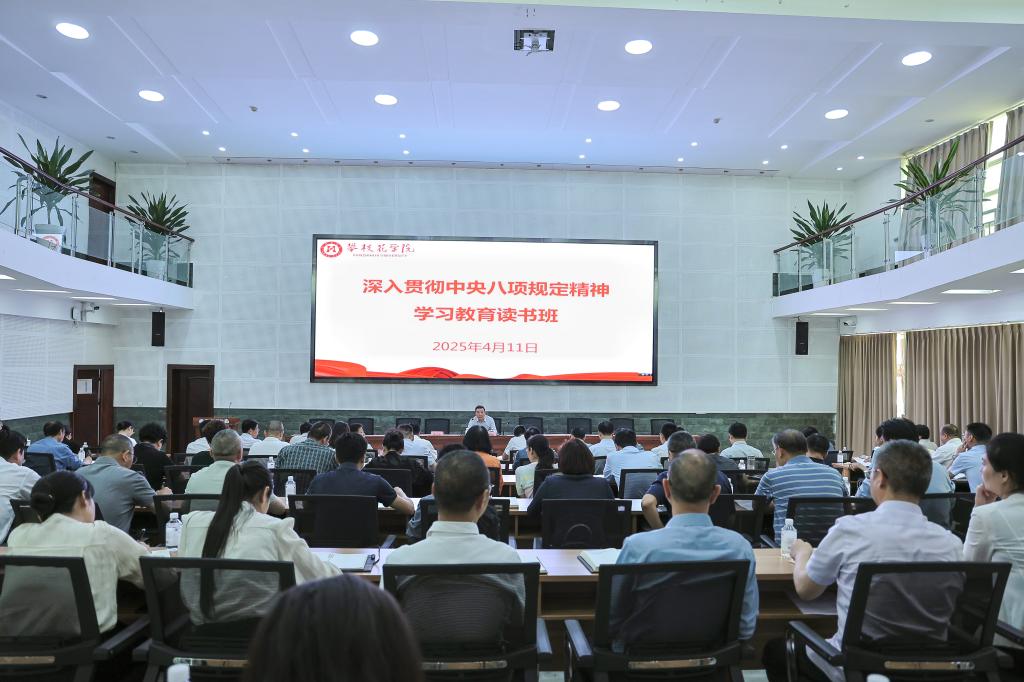 4月11日下午,beat365在图书馆博雅厅举行深入贯彻中央八项规定精神学习教育读书班开班仪式。党委书记胥刚主持会议并讲话。校领导班子成员、全体中层干部参加学习,校学习教育工作专班成员列席会议。