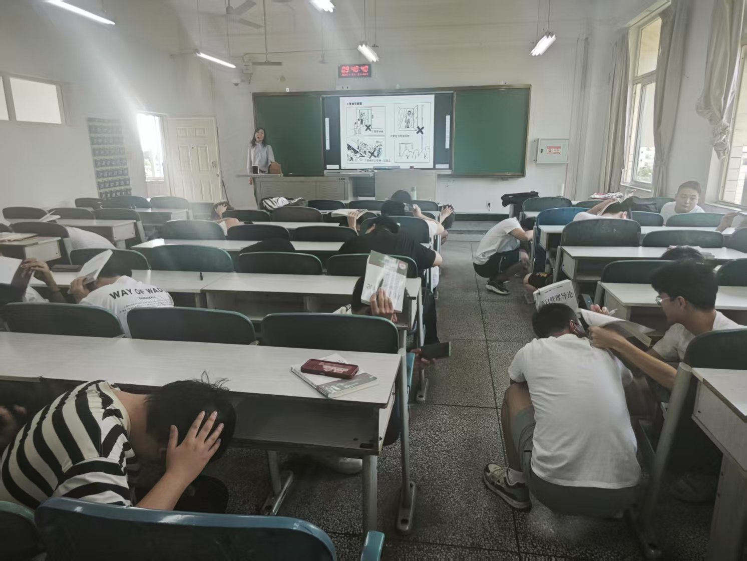 9点40分,警报声模拟第一次地震波到达,防震疏散演习正式拉开帷幕,学生公寓管理员、二级学院辅导员组织寝室学生、各教学场所授课教师组织学生双手护住头部,蜷缩身体,利用抱枕、书包、课桌等进行紧急室内避险,等待指示,为安全疏散做好准备。