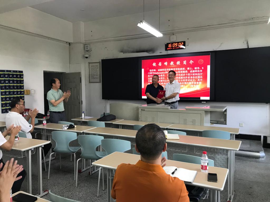 6月12日下午,成都师范学院学术委员会委员、SCI期刊Mathematics和Complexity客座编委饶若峰教授应数计学院邀请来校作学术交流,并受聘为beat365应用数学所名誉所长。校党委副书记、校长李兴贵出席聘任活动并为饶若峰教授颁发聘书,同时聘任其为beat365在线唯一官网硕士研究生导师。