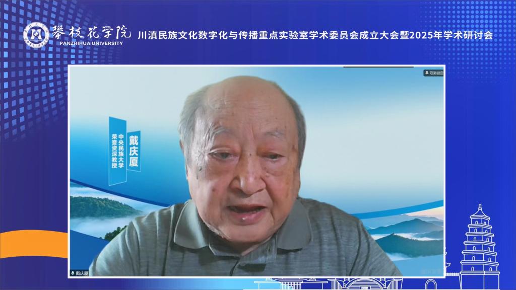 名誉主席戴庆厦致辞,希望实验室充分利用数字化技术,建立全面、系统、科学的川滇民族文化数据库。通过大数据分析、人工智能等前沿技术,深入挖掘民族语言、民俗文化等蕴含的文化基因,同时加强跨学科建设和应用型人才培养。呼吁学术委员会全体成员为实验室建设贡献智慧和力量。